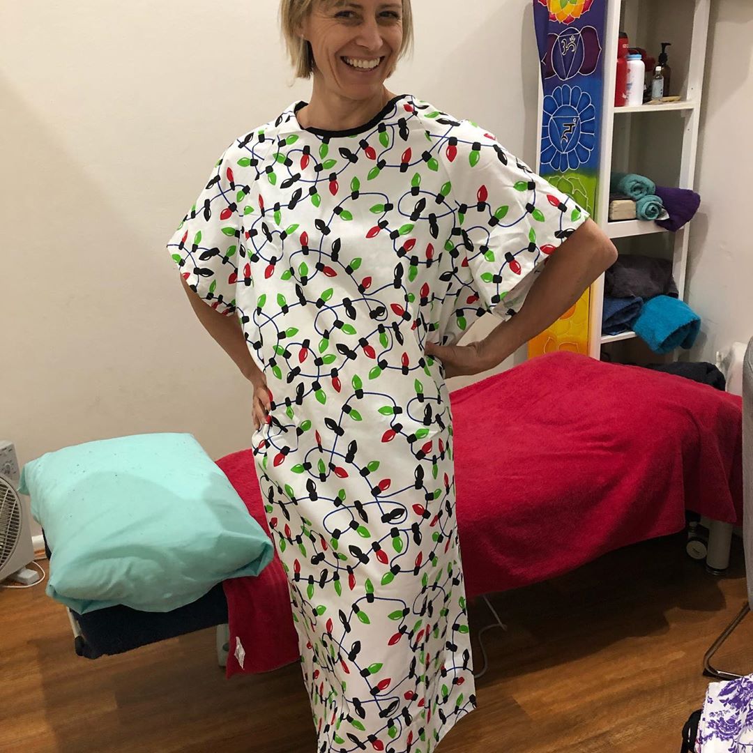 PATIENT GOWN HALF SLEEVE IN LIGHT PRINT WITH BLACK PIPING BACK OPEN