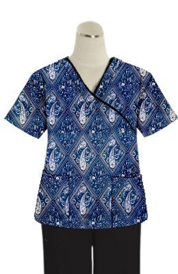 Home :: SCRUB SETS :: PRINTED SCRUBS SETS :: PRINTED MOCK WRAP SETS :: Printed scrub set mock wrap 5 pocket half sleeve in Blue with Blue Classical Print With Black Piping (top 3 pocket with bottom 2 pocket boot cut)