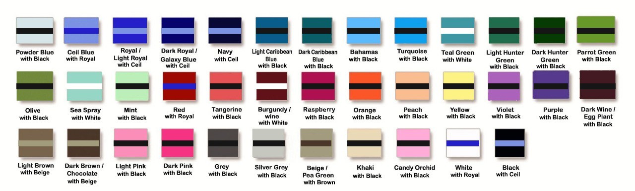 Available In 37 Colors (Navy with ceil, White with Royal, Black with Ceil, Dark Royal / Galaxy Blue with Ceil, Red with Dark Royal, Ceil Blue with Dark Royal, Purple with Black, Light Hunter Green with black, Royal / Light Royal with Ceil, Burgundy / Wine with white, Bahamas with black, Dark Pink with Black, Grey with Black, Teal Green with white, Khaki with Black, Light Caribbean Blue with black, Light Pink with Black, Light Brown with Beige, Orange with Black, Beige / Pea Green with Brown, Yellow with Black, Dark  Caribbean Blue with black, Olive with Black, Parrot Green with Black, Dark Brown / Chocolate with Beige, Dark Hunter with Black, Candy Orchid with Black, Dark Wine / Egg Plant with Black, Violet with Black, Powder Blue with Black, Silver Grey with Black, Sea Spray with Black, Raspberry with Black, Mint with Black, Peach with Black, Tangerine with Black, Turquoise with Black)