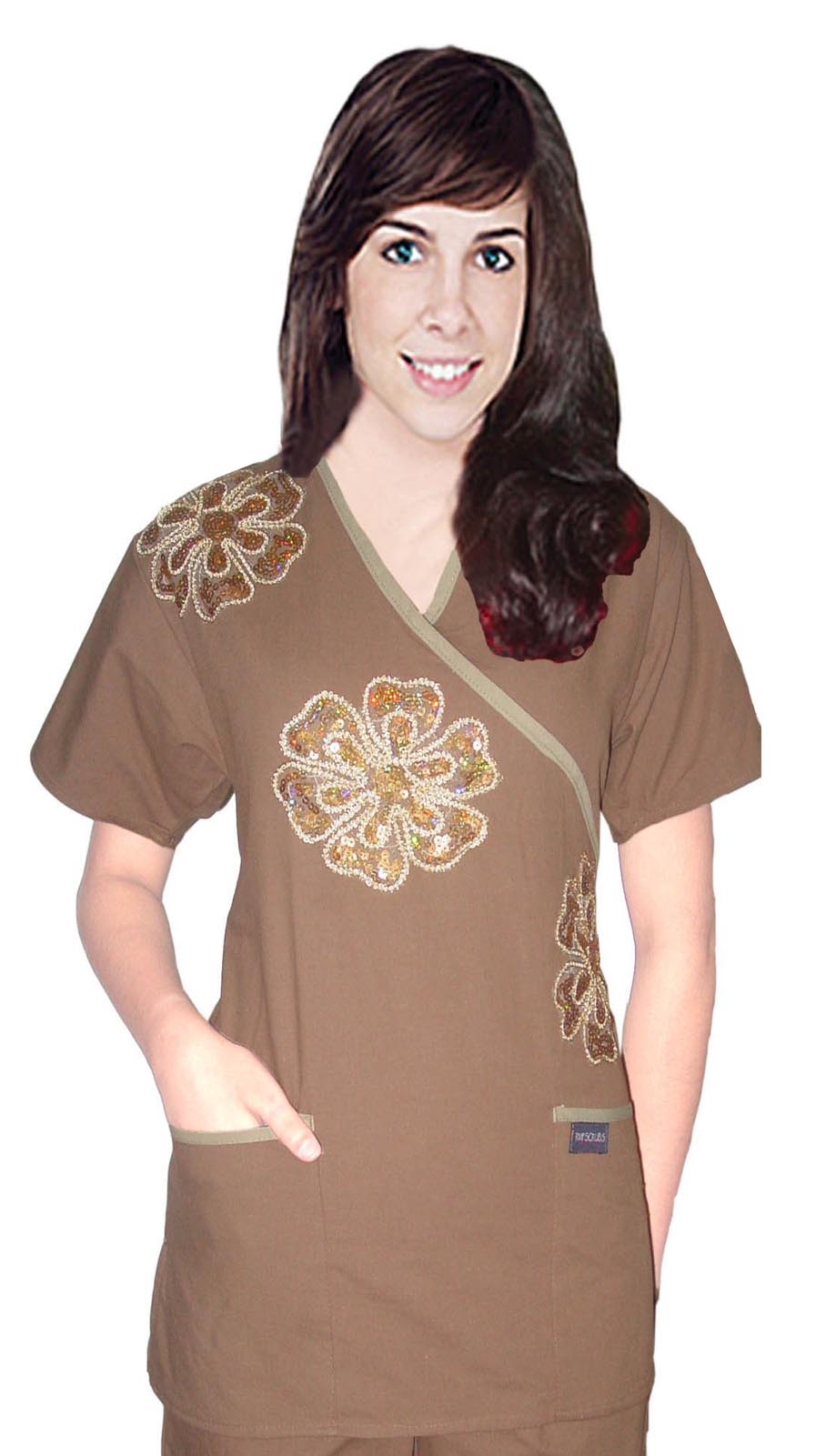 Home :: SCRUB TOPS :: STYLISH TOPS :: Poplin Stylish top big golden flower crossover top 2 pocket half sleeve (65% Polyester, 35% Cotton)